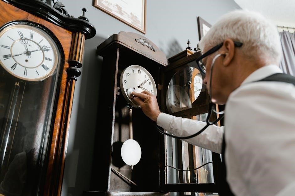 Pendulum length directly influences the clock’s rate – longer pendulums swing slower, resulting in a slower time, and vice versa. Minor adjustments to the pendulum bob’s position allow for precise calibration. Ensuring the pendulum swings freely, without obstruction, is crucial for reliable operation and maintaining accurate time.